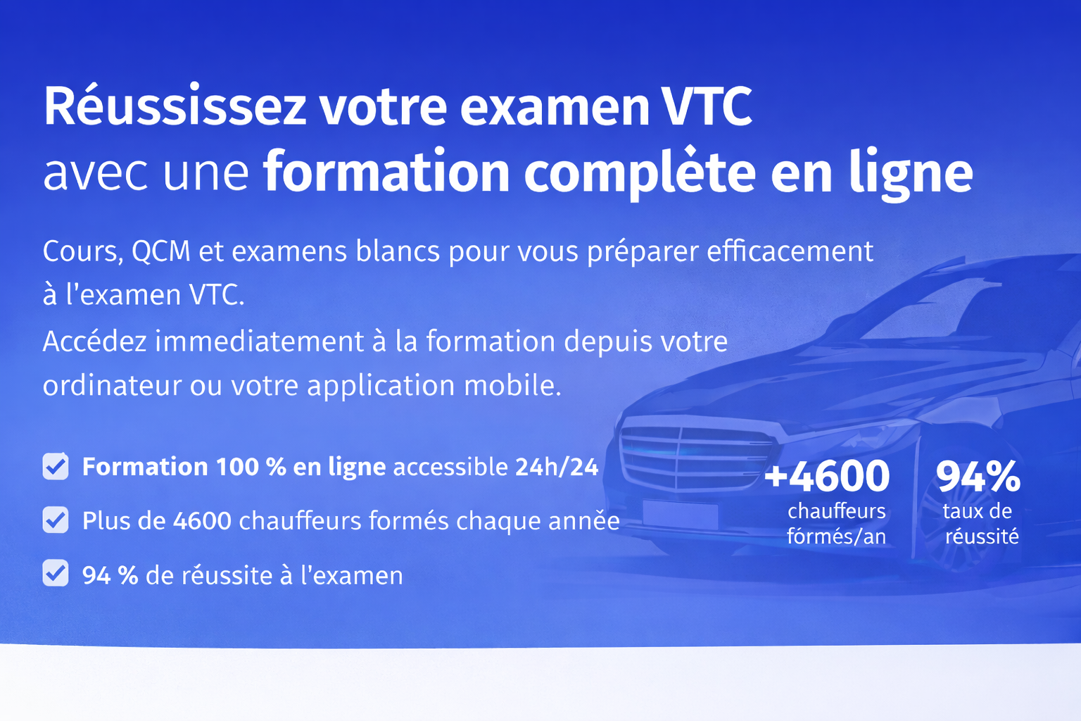 Inscription gratuite – Commencez immédiatement la formation VTC. Cours, QCM et examens blancs disponibles sur ordinateur et application mobile.